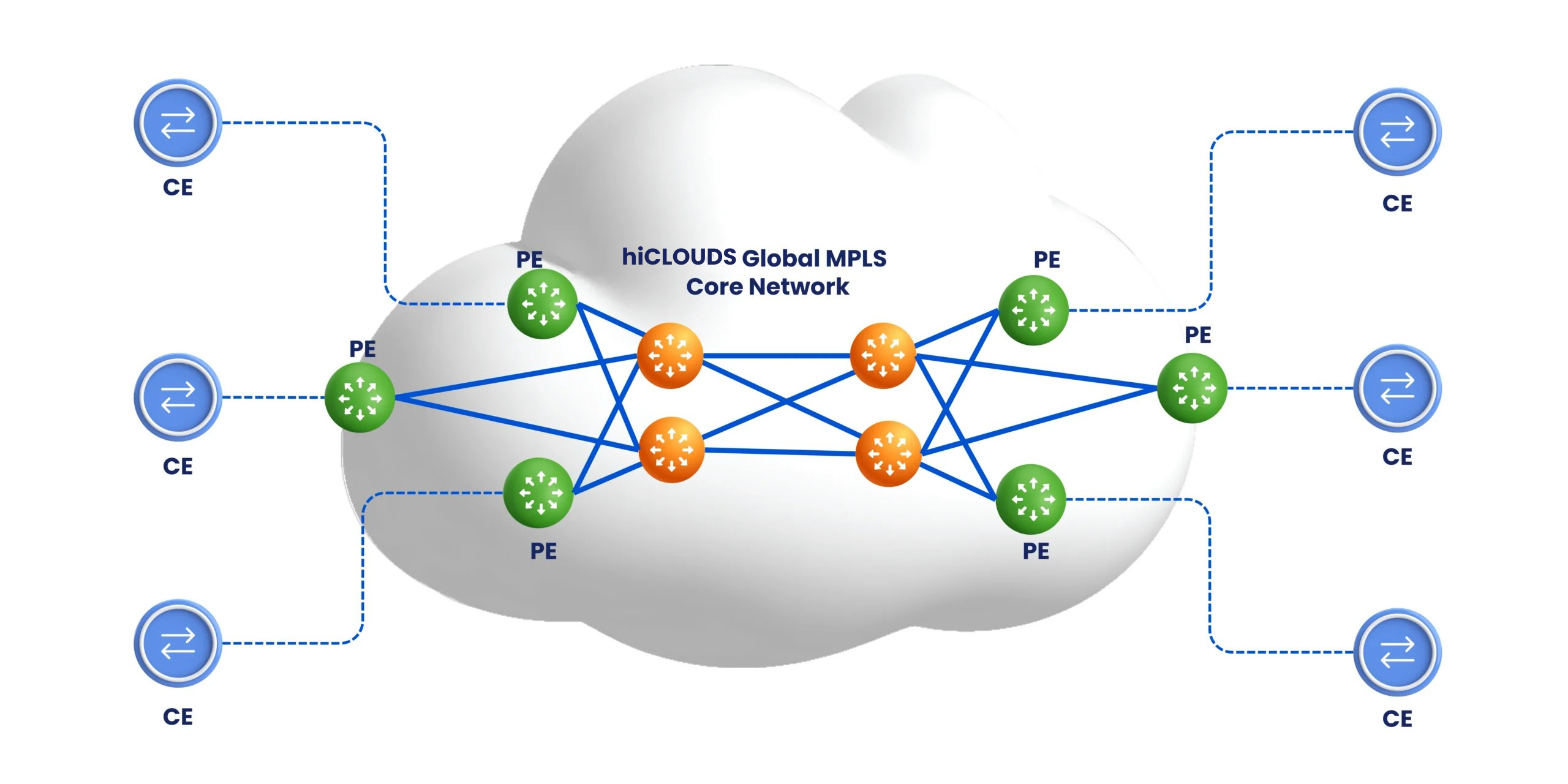 This MPLS architecture connects customer sites (CE) to a global private backbone via Provider Edge (PE) routers. Inside the core network, traffic is routed through high-speed MPLS nodes (P routers) using label switching. The fully meshed design ensures redundancy, low latency, and automatic failover—delivering secure, high-performance connectivity across all enterprise locations.