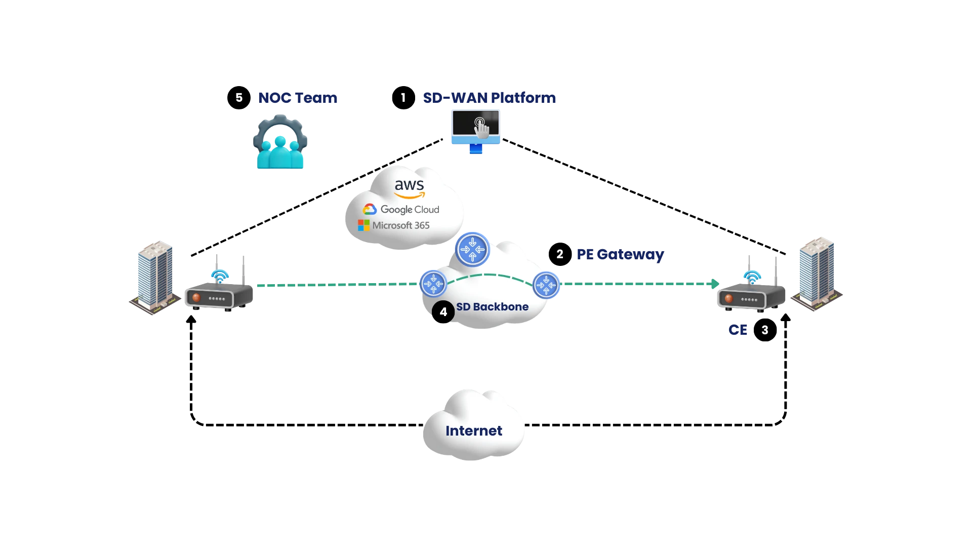 The SD-WAN topology is designed for high availability and intelligent traffic handling. It connects Customer Edge (CE) devices across sites to centralized PE Gateways over a mix of broadband, 4G/5G, and MPLS. A secure SD-WAN platform, monitored by our NOC team, dynamically routes traffic based on application needs and real-time link quality. This ensures low latency, built-in redundancy, and seamless failover across all connected sites.